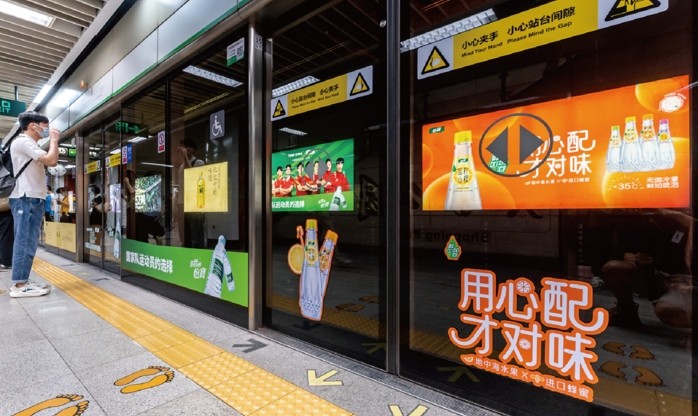主要分布在不同線路站廳換乘的通道內(nèi),覆蓋雙線客流密集的換乘區(qū)域,墻貼+燈箱的媒體組合拳加速品牌代入感,形成獨立的超級品牌空間,