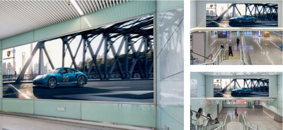 媒體面對磁浮地鐵通道出口處,全方位覆蓋磁浮到達及離開機場旅客。 不遠處為旅客休息區,具有受眾距離近,具有醒目、全面、沖擊力強的展示特點, 受眾人群廣,宣傳效果佳。